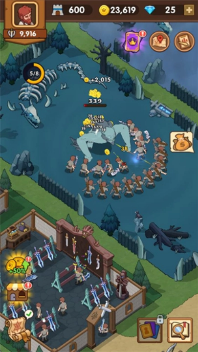 想要开启新的工坊区域,必须先战胜对应的boss;不同工坊会产出对应职业的兵种单位。