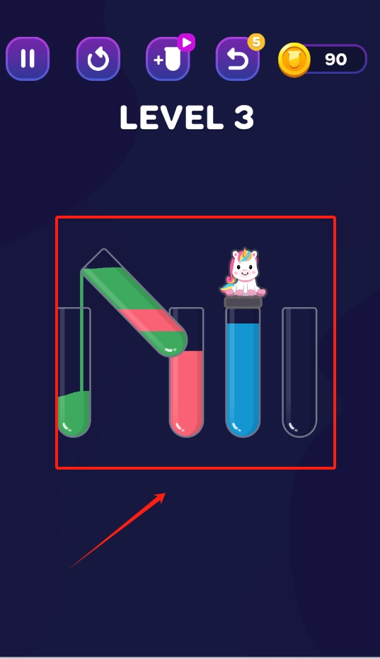 往那个中间带有独角兽图案的试管里倒入红色的液体,要特别注意只能添加颜色相同的液体,这样就能完成第二关的任务了。
