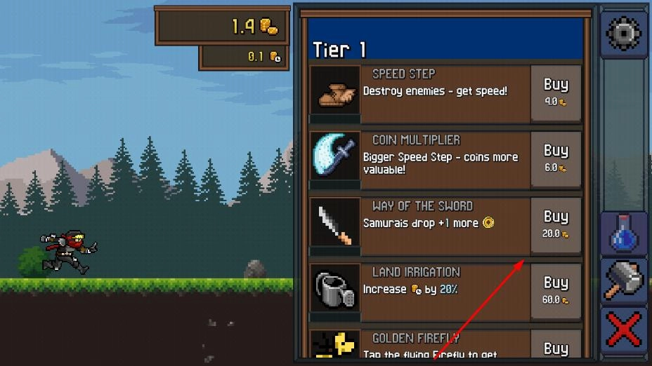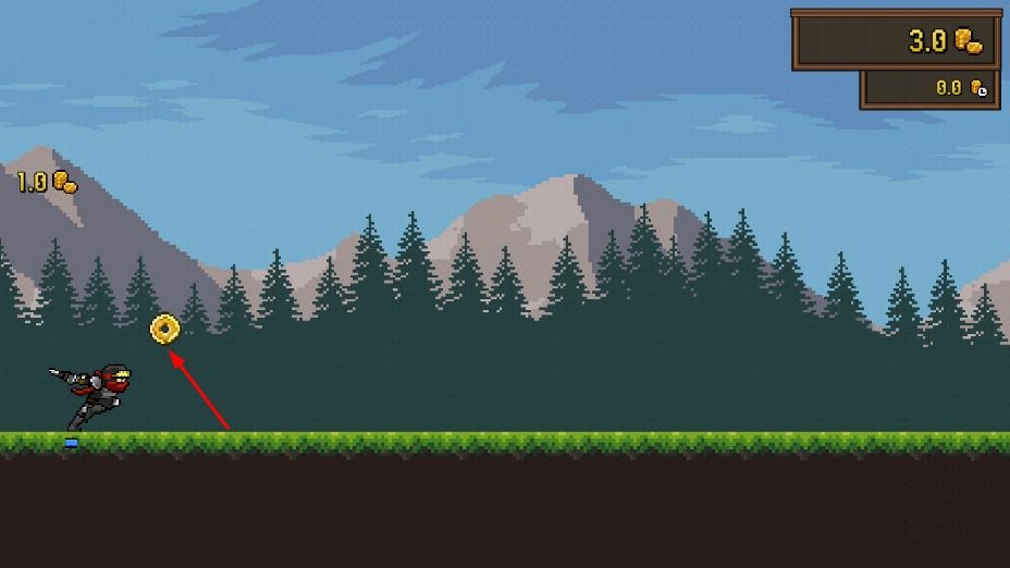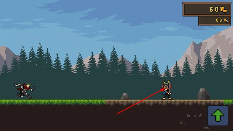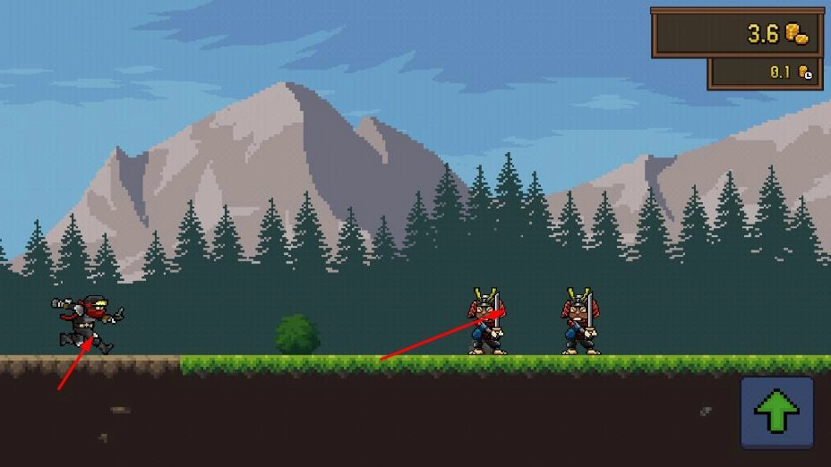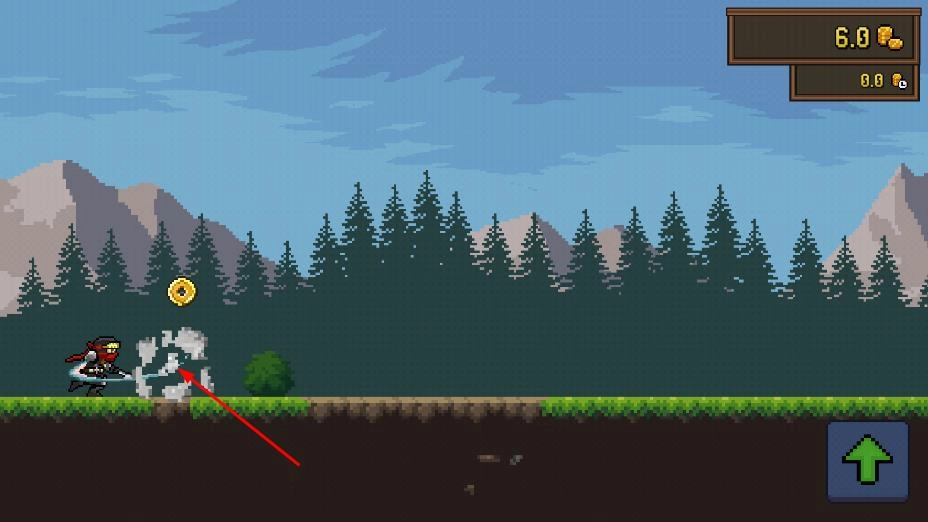 打开应用后,控制着由像素构成的忍者角色,在布满树木与青草的环境中向前疾驰,此时设备屏幕的上半部分会呈现出金币之类的游戏道具。