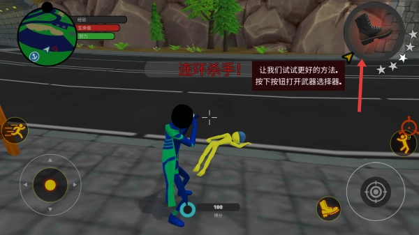 长按右侧的近战攻击按钮,朝着黄色的敌人火柴人出拳,把它击败。
