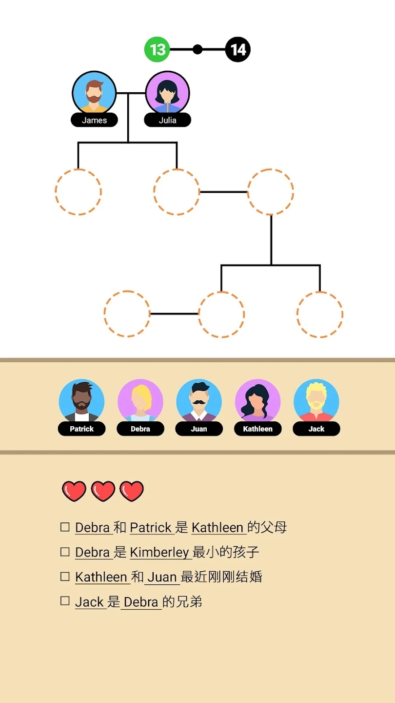 Family Tree是一款休闲向的解密游戏,核心玩法围绕梳理家谱展开——玩家需依据文字给出的人物关系线索,在树状图中为角色找到正确位置。游戏兼具烧脑与趣味性,既能锻炼逻辑思维、专注力和记忆力,还巧妙融合了家族故事与数织艺术,让玩家在解谜过程中探寻家族历史,同时收获独特的思维挑战与情感体验。