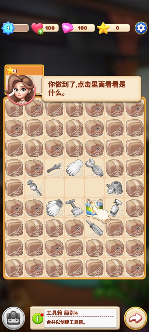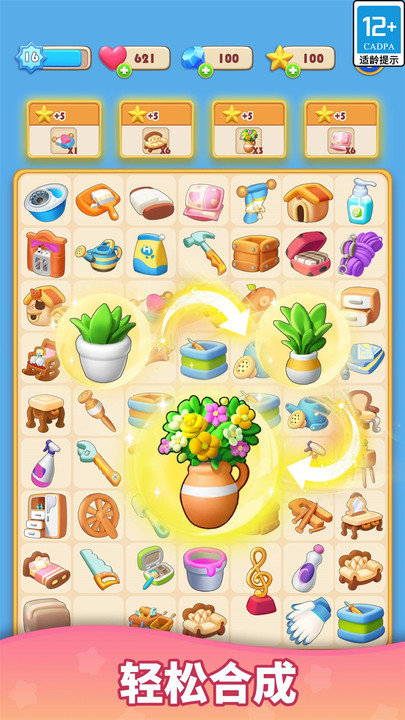 轻松上手:把拼图游戏板上的两个相同元素合并起来,就能创造出新的物品和工具,用来翻新客厅、卧室、厨房、花园以及温室等各式各样的房间。