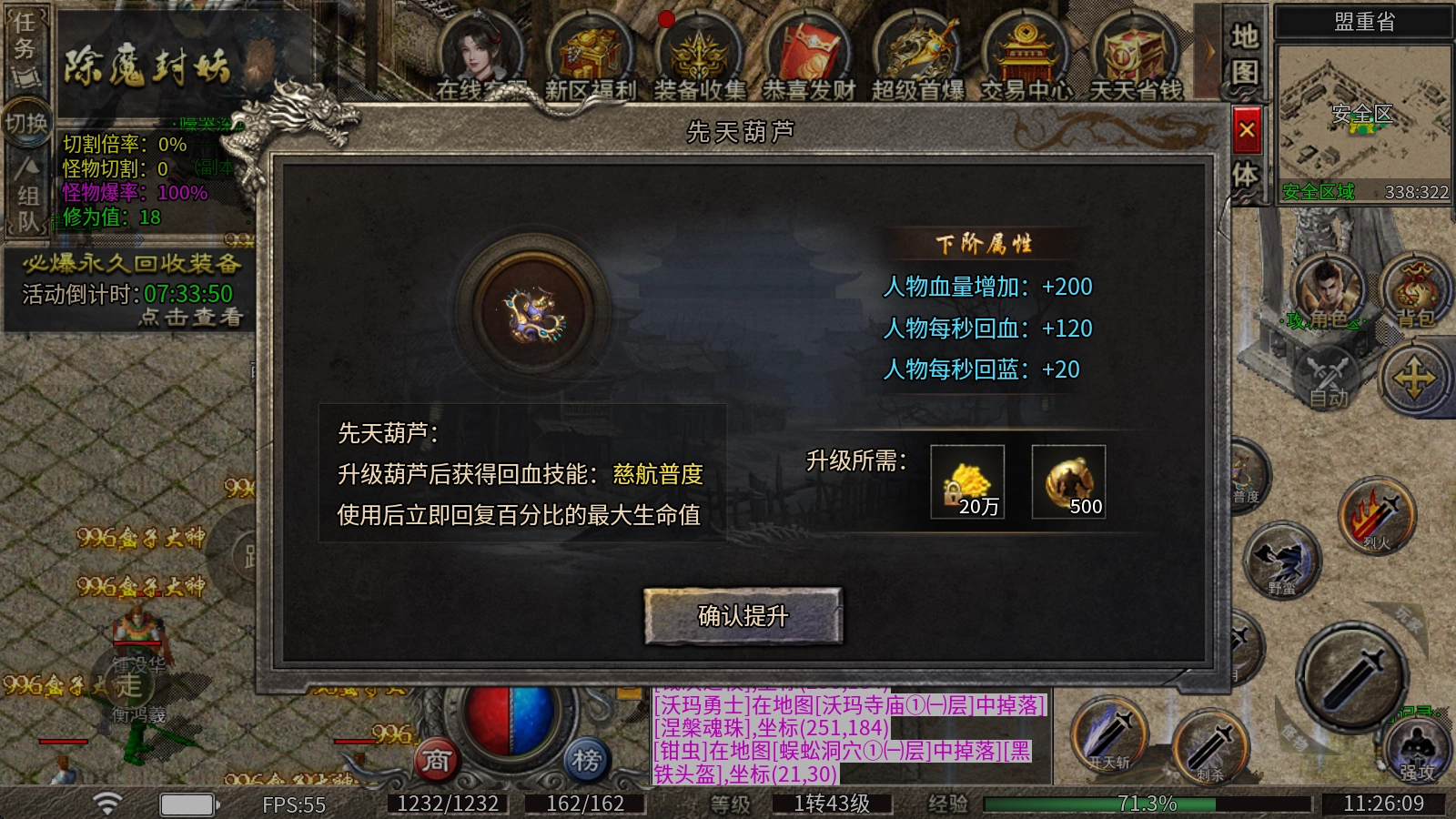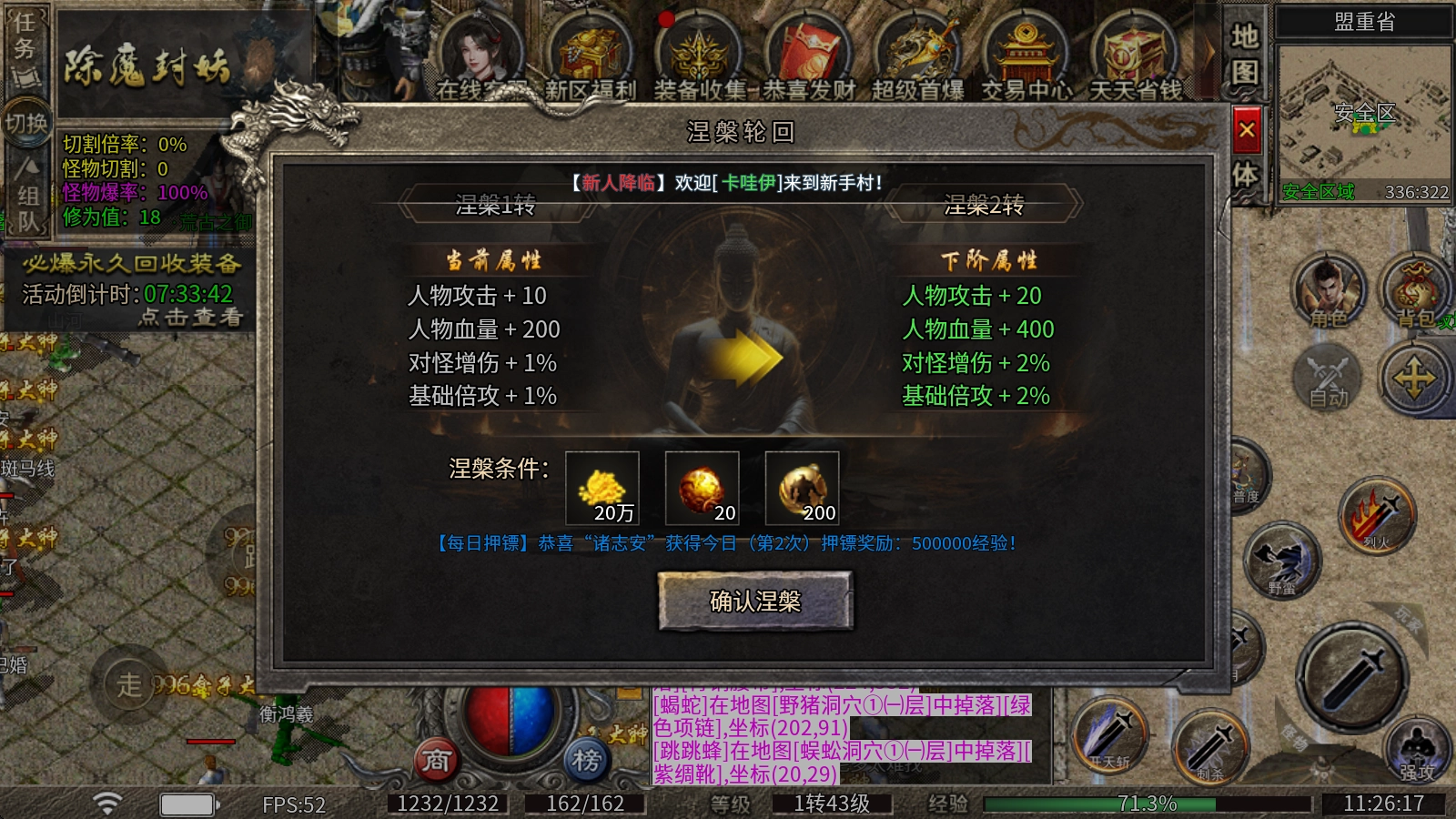 轮回转生系统:玩家可通过消耗涅槃魂珠、修为值与金币来提升等级,每次升级都将增强攻击、生命值、对怪物的额外伤害以及基础倍攻属性。其中,涅槃魂珠和修为值可通过挑战怪物获取。