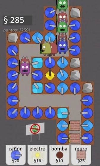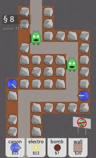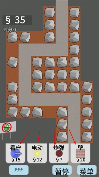 在对局过程中,玩家能够使用金币购买看守、电动类等建筑,并将它们合理布置在路径上,以此来阻挡绿色怪物,守护禁止区域。