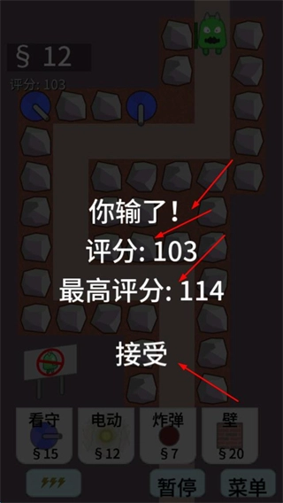失败后查看当前评分和最高评分,点击接受总结自身不足,调整建筑的搭配与摆放方式,重新开始以提升成绩。