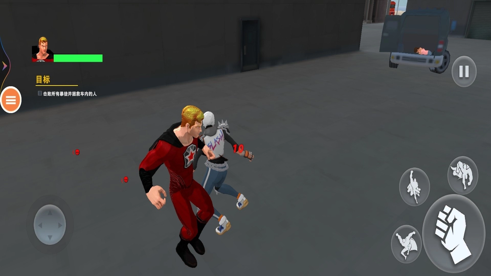 只要成功把所有敌人都打败,就能解救被绑架的市民。玩家在战斗过程中得留意自己这边的血量条,只有保持健康状态,才能继续战斗下去。