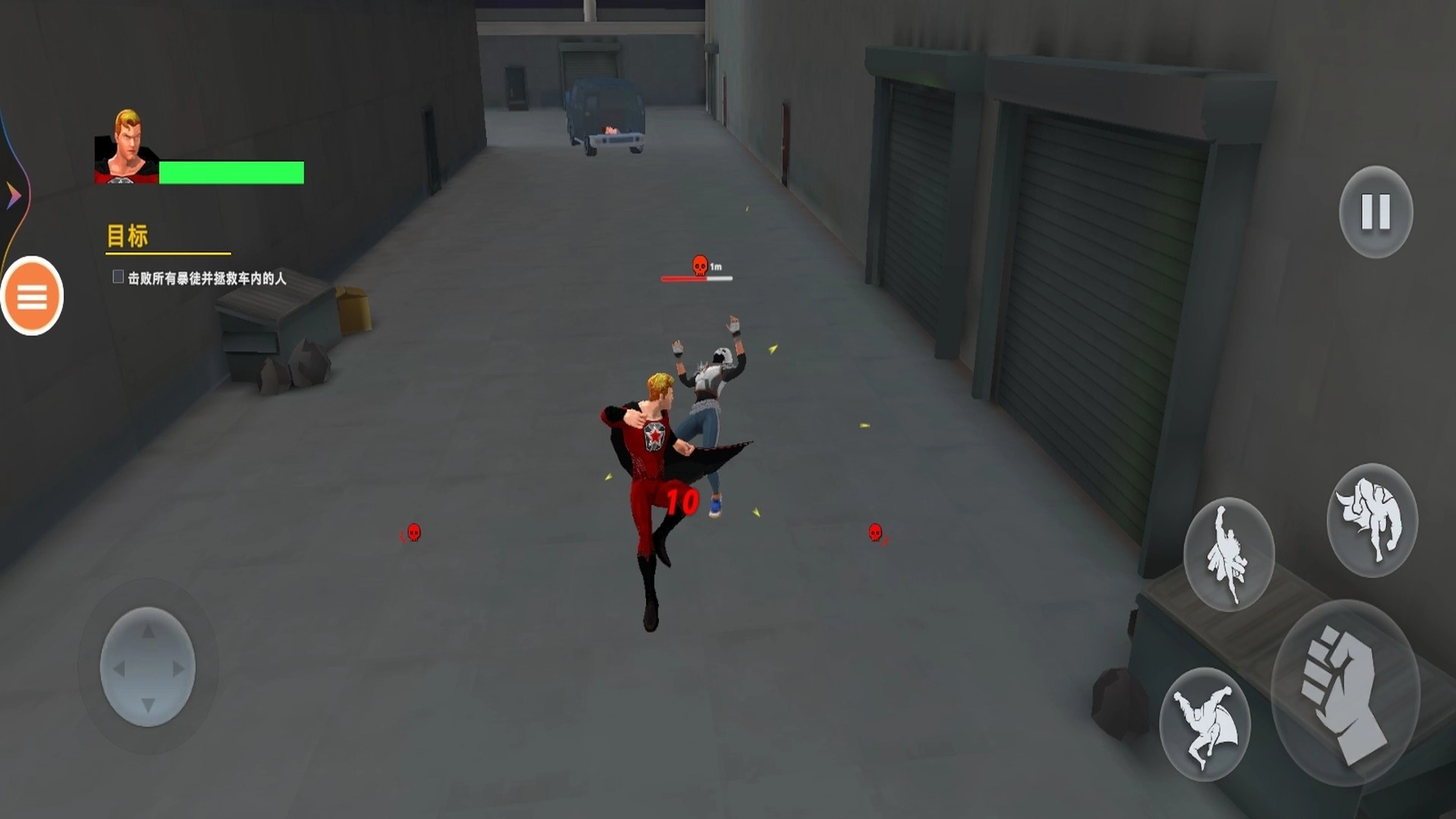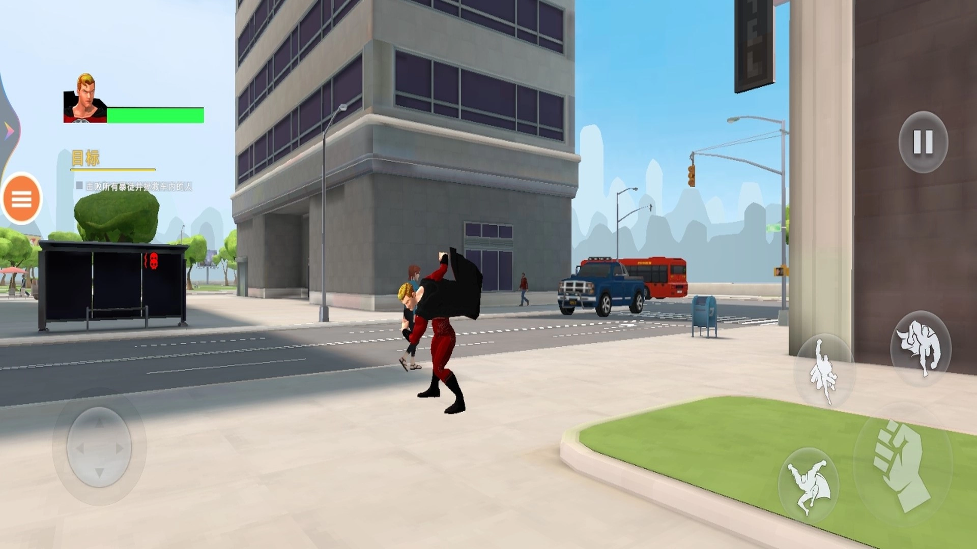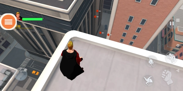 现在玩家需要操控超人飞往目的地,通过左侧的虚拟摇杆来控制角色移动,右侧的按钮则用于操控飞行与战斗。