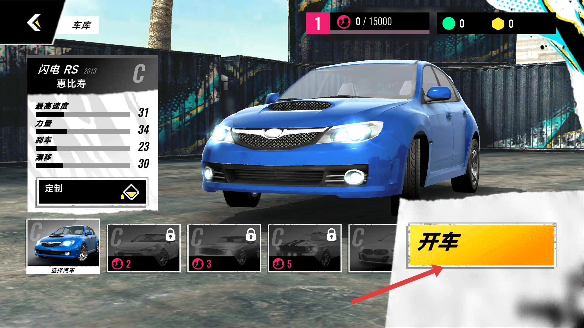 进入车库界面后,你会看到多种赛车可供挑选。浏览每辆赛车的最高速度、力量等属性信息,选定自己喜欢的那一辆,接着点击开车按钮,就能进入赛道了。