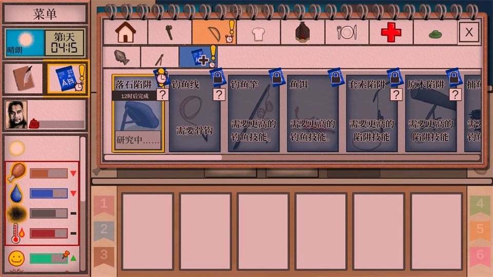 复杂健康系统:角色的身体可能出现晒伤、擦伤、骨折、动物咬伤等各类状况,也可能因细菌或寄生虫感染而引发发烧、腹泻等病症。玩家需要借助特定植物来进行治疗,例如将蜘蛛兰碾碎后加入开水可以制作成抗生素汤,芦荟则能用来合成芦荟膏以加快伤口愈合速度。与此同时,游戏还融入了心理状态的模拟机制,玩家会遇到无聊、焦虑、抑郁等情绪问题,通过与动物互动、组织趣味活动等方式能够有效缓解这些负面情绪。 环境与生物应对:除了四季更迭带来的变化外,岛屿上还生存着丰富多样的生物。玩家既可以驯化猴子等动物让它们陪伴自己,也要对野猪等危险生物保持警惕。在狩猎野猪的过程中,如果操作失误很容易造成开放性伤口,此时需要使用缝线进行止血,并配合灰绷带、芦荟膏来处理伤口。另外,猴子会偷窃地面上的食物,只要及时将物资收纳好就能防止这类情况的发生。
