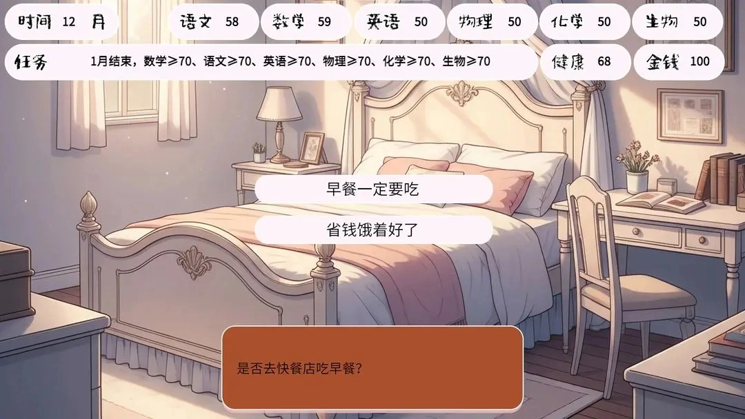 治愈向的成长内核:剧情遵循“压抑开篇、温暖收尾”的逆袭路径。主角在母亲患有抑郁症、父亲酗酒成性的家庭环境中,以《风雨哈佛路》的主角为精神榜样奋发图强,最终有机会考入985大学。游戏不侧重“战胜”困境的叙事,而是传递“接纳困境、努力成长”的价值理念,为玩家带来情感层面的治愈。同时,不同结局的设定,也让玩家的每一次选择都承载着成长的仪式感。