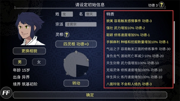 进入初始界面后,选择【四灵根】特质并搭配【貌美】特质,再消耗3点功德值,以此为宗门开局打下基础。