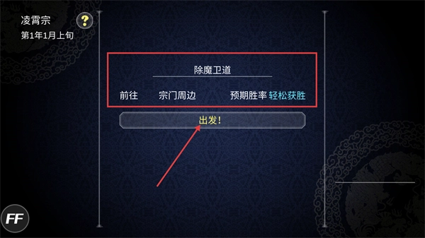 在除魔卫道界面点击【出发】按钮前往【宗门周边】,轻松获胜就能获取初始资源,为后续发展助力。