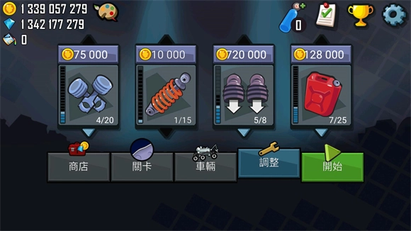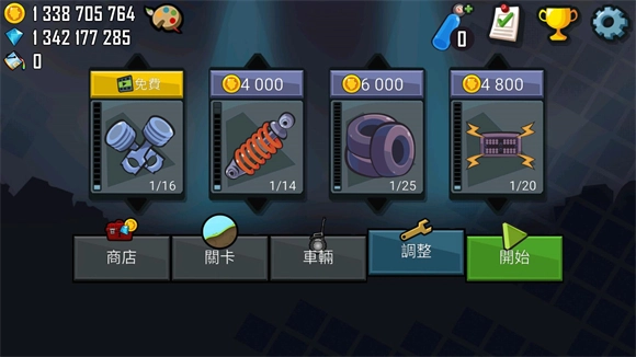 在界面点击“调整”选项即可对车辆进行改装,每项改装操作都需要消耗金币来完成升级。第一项可升级的是引擎,它相当于车辆的马达,引擎等级越高,车辆的行驶速度就越快,爬坡时的动力表现也会更出色。第二项升级内容是悬挂系统,悬挂的等级越高,车辆在行驶过程中的稳定性就越强,发生翻车的概率也会相应降低。
