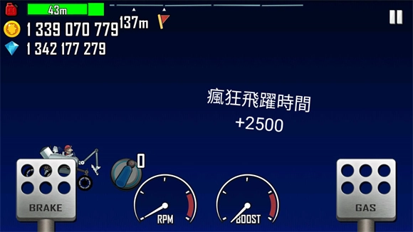 飞行时得适时点一下油门和刹车调整位置,不然掉下来容易让车子翻掉,只要留意这点就能一直赚钱,单关刷十几万完全没问题。