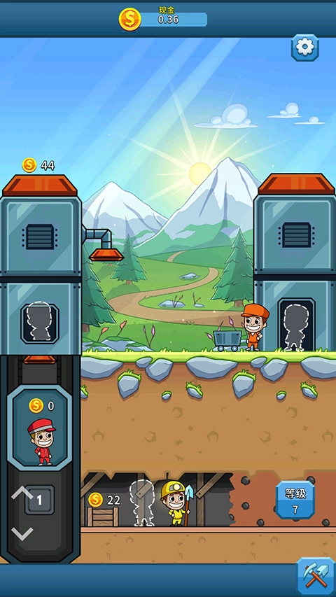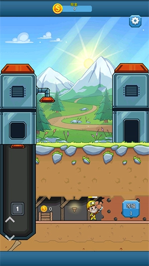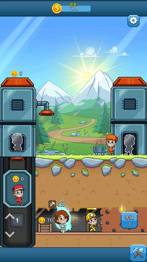 首先按照新手指引,点击地下矿里穿黄色衣服的矿工,他就会开始挖矿;等矿挖好后,他会把矿石背到左边靠近电梯的小箱子里。这时点击电梯中穿红色衣服的矿工,他会把箱子里的矿石传送到上方的机器里。接着点击地面上推小车的红衣服矿工,他会推着小车到机器下方接住金币,再送回原地。这三个矿工的操作规律很清晰:地下穿黄衣服的矿工可以持续挖矿,电梯里的矿工只需负责把挖好的矿石往上运送,地面上的矿工则在机器下接住矿石并推回原地,就能获取金币了。