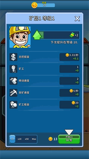 升级是大家比较关注的问题,升级入口在右下方黄色的找人挖金矿处,只要金币数量充足,界面上就会出现向上的箭头提示,此时就能进行升级操作。随着等级的提升,挖矿获得的金币数额也会相应增加,初始1级时每次挖矿可得11个金币,到5级时每趟就能挖到29个金币。升级速度越快,获取的金币也就越多!