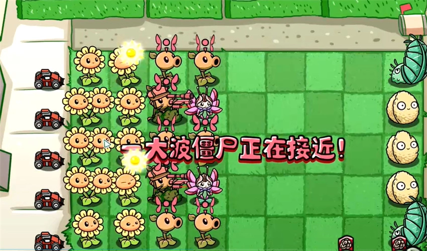 僵尸首次出现时,我们可以放置毁灭蘑菇来消灭它们。不过,阳光菇的种植可不能忽略。