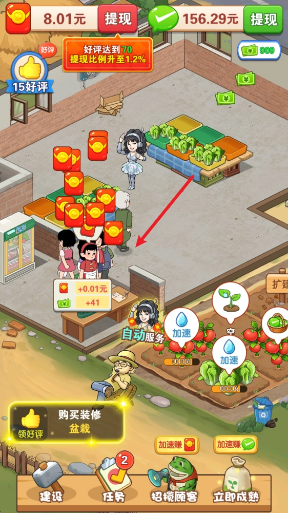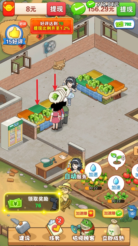 收获后的货源会被投放到菜市场里,点击客人头顶的图案就能开展销售。