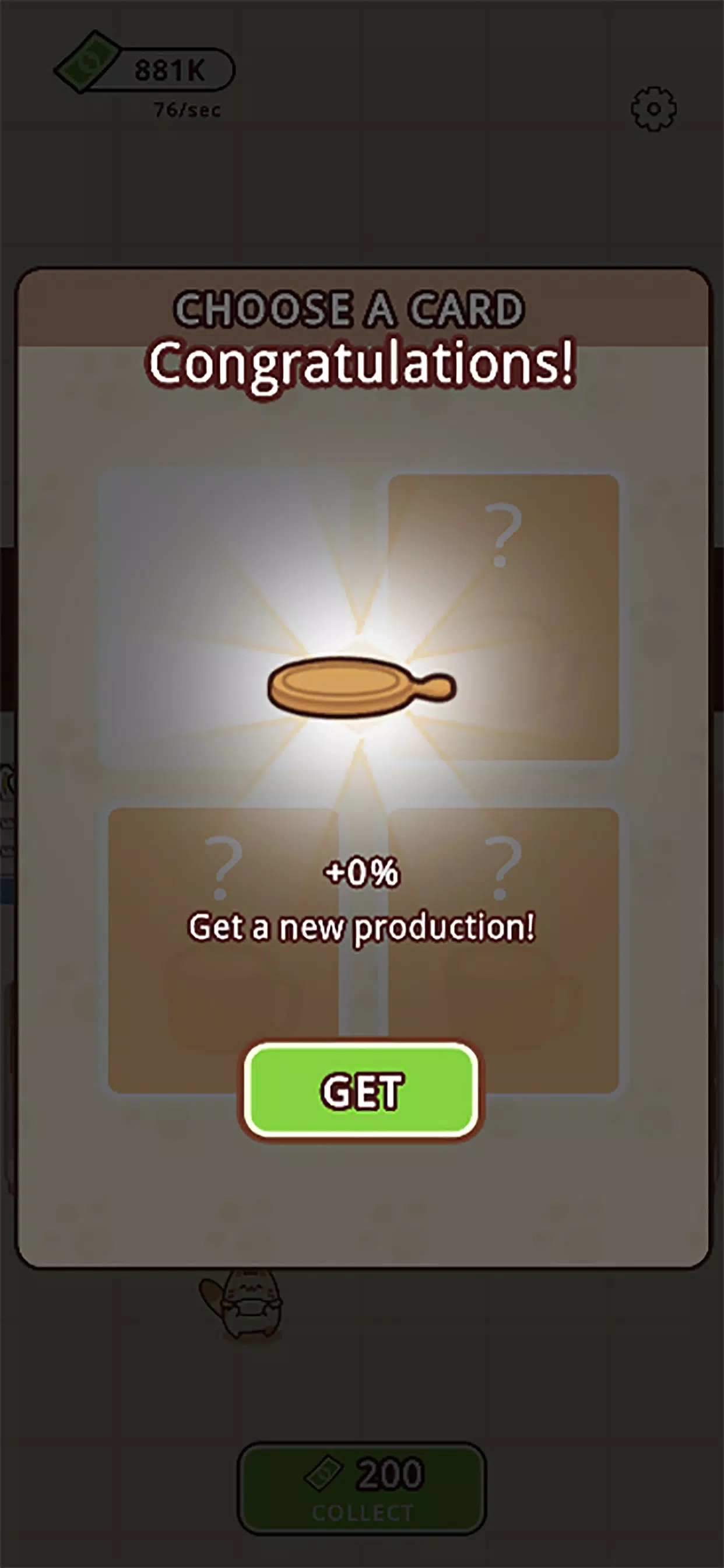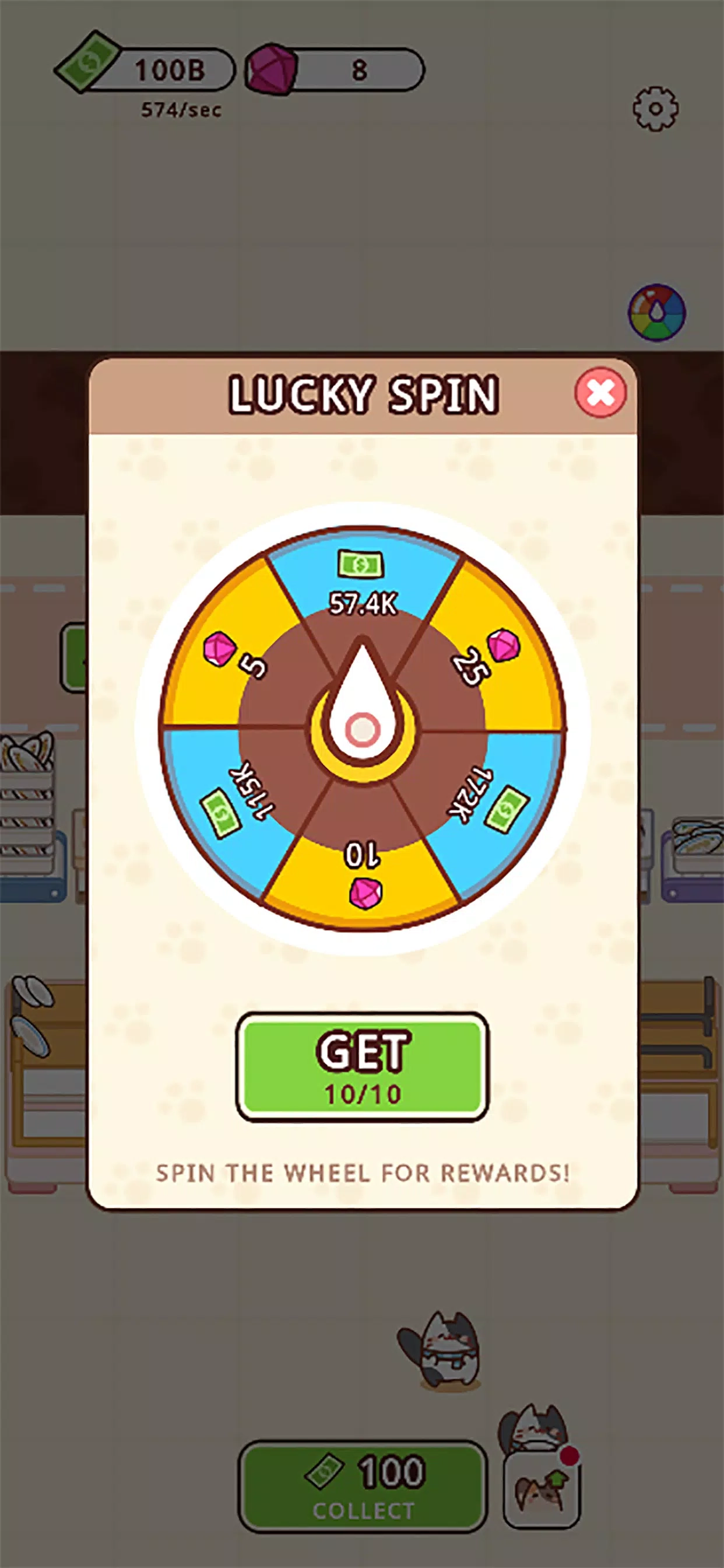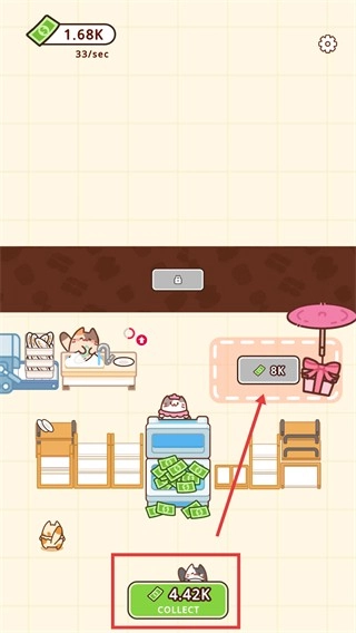 消耗相应钞票可为猫咪升级,以此提升其工作效率,之后只需等待【COLLECT】按钮积累收益即可。