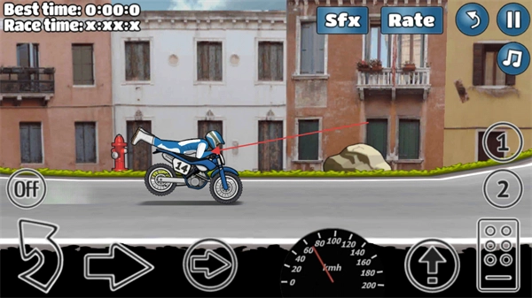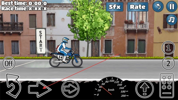 通过操控方向按钮来控制摩托的移动,在赛道上启动并行驶,开启特技挑战。