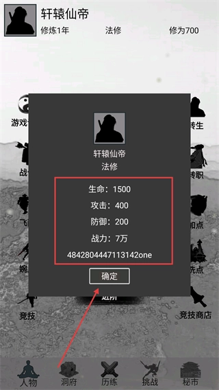 查看角色属性面板,确认生命、攻击等数值后点击【确定】,即可继续进行修炼或挑战玩法。