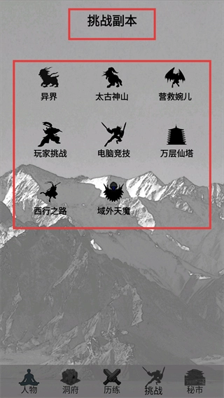 进入挑战副本的界面后,挑选像【异界】【太古神山】这类副本发起挑战,以此获取资源来增强自身的修为与战力。