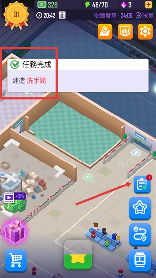 建造完成后,系统会弹出【任务完成】的提示,点击箭头指向的任务图标进入任务界面即可领取奖励。