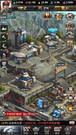 升级建筑时,建议优先考虑指挥中心与研究所,资源类建筑可稍缓一步,兵工厂等设施则排在更后面,仓库之类的建筑可以最后升级。提升VIP等级后,就能解锁购买额外建筑队列的权限。在资源储备充足的情况下,多一个建筑队列能让你的发展速度比其他玩家更快。VIP等级越高,可购买的队列数量就越多,具体能买多少,大家可以在游戏内查看VIP特权说明,这里就不再详细介绍了。