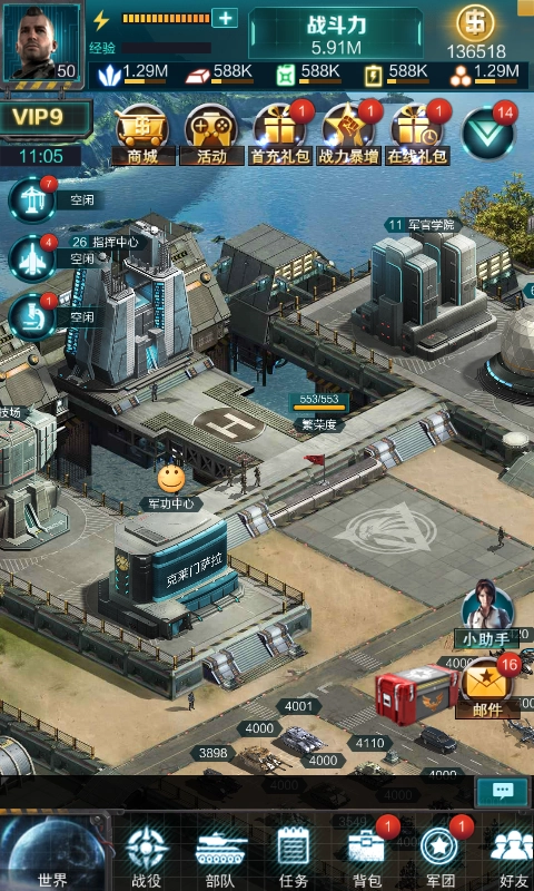 前期升级的核心途径就是反复刷任务和打战役。刚开始的时候,跟着任务指引逐个完成任务,中间也能去打打战役——这里得特别说一下,打战役是不会损失士兵的,完全不死兵!是不是感觉超爽?不过手里的武器还是需要修理的,所以新手阶段得把控好打战役的频率,尽量用最小的消耗来获取最大的回报。毕竟前期晶矿挺珍贵的,要是全花在修理武器上就太不划算啦!