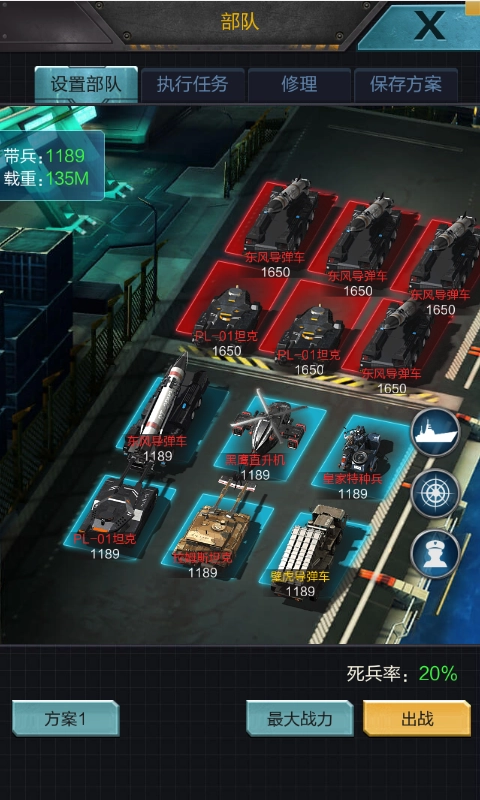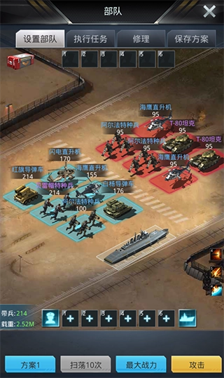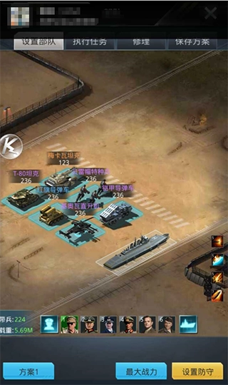 布阵时,若已明确敌方阵容,原则上第一排应避免放置被敌方克制的兵种,优先安排能克制敌方部队的兵种;若没有克制关系,则优先选择坦克和特种兵。第二排同样优先考虑克制敌方部队的兵种,若没有合适的克制兵种,可多部署导弹车和飞机,这样能显著提升输出能力。