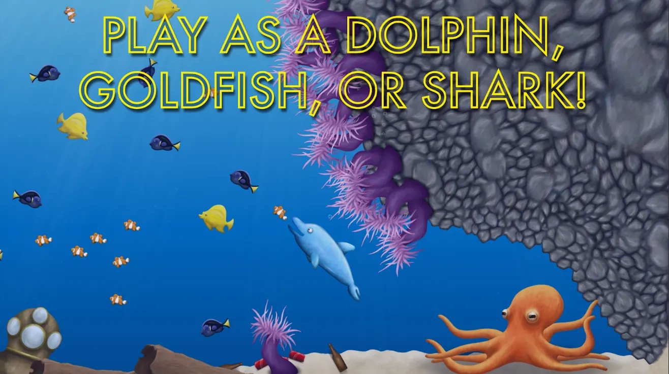 除了扮演金鱼,你还能化身饥饿的海豚和贪婪的鲨鱼。海豚最初是过度劳累的水族馆明星,为了获取食物,被迫穿过炽热的火焰跳过火圈。