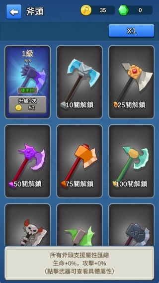 有多种斧头可供解锁,解锁每种斧头都要消耗不同数量的金币,能帮助角色快速提升战斗能力。