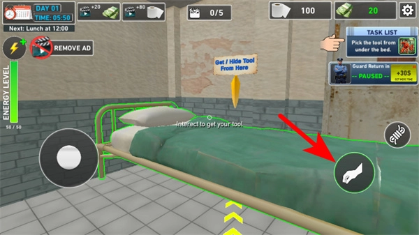 点击箭头所指的交互按钮,这是获取工具的基础操作,按照提示步骤进行操作就能获得对应的道具。