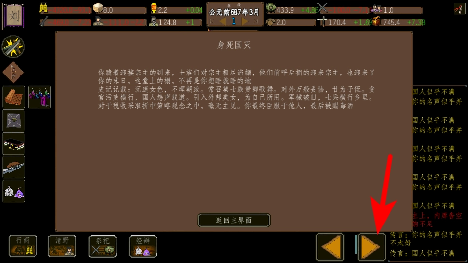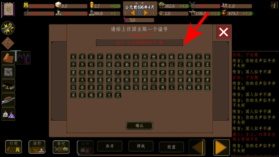 进入游戏后,点击箭头所指的谥号文字区域,这是确定前任国主称号的关键步骤,选中文字后就能继续推进流程。