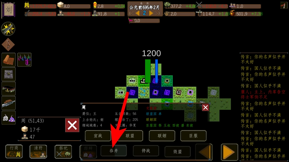 请跟随箭头所指的方向,点击“吞并”选项——这是整合目标势力的关键步骤,执行该操作后就能顺利完成与对应势力的合并。