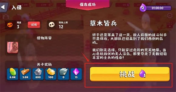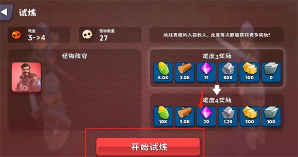 点击“入侵”后,你会看到左上角有个“试炼”按钮。点击它就能提升难度,敌人的数量和战力都会增加,不过之后能拿到更多紫宝石哦。