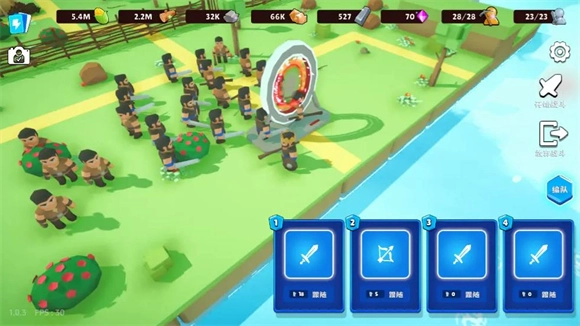 游戏开局按常规流程来,先随便收集些资源把房子建起来。之后一边招募农民,一边想办法提升粮食的获取速度——可以杀杀猪,直到粮食储备满仓。这时候你会发现,最开始刨地一次只能得1个粮食,后面再刨就能收获很多了。接下来把能升级、能解锁的功能都过一遍。等需要紫钻的时候,就去右下角地图上的传送门那里打试炼,随便打打就能拿到些紫钻,记得把离线收益的科技点出来,这个功能特别关键。