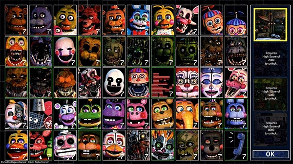 UCN终极自定义夜是一款以玩具熊为题材的诡异冒险游戏,玩家要扮演夜间保安,在遍布玩偶的环境里撑到早上6点。游戏提供50个可选动画角色作为敌人,玩家能把它们的难度调整在0到20之间。每个角色都有独特的行为模式与攻击方式,难度越高,角色的行动就越频繁,其攻击也越难招架。