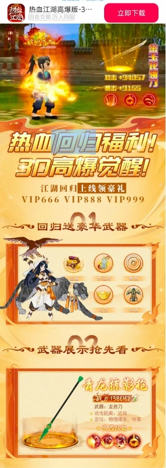 3、融入自创武学、神兵幻化、帮派押镖等创新元素,以及限时高爆副本这类特色玩法,既有着超高的爆率,还结合了独特规则与丰厚奖励。
