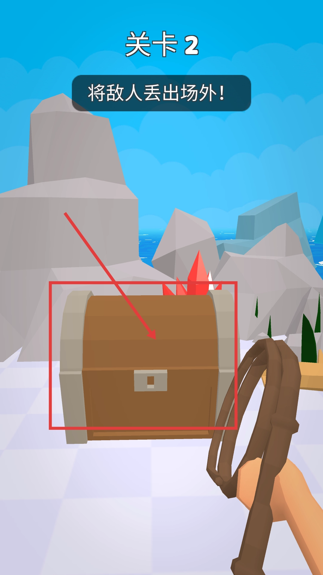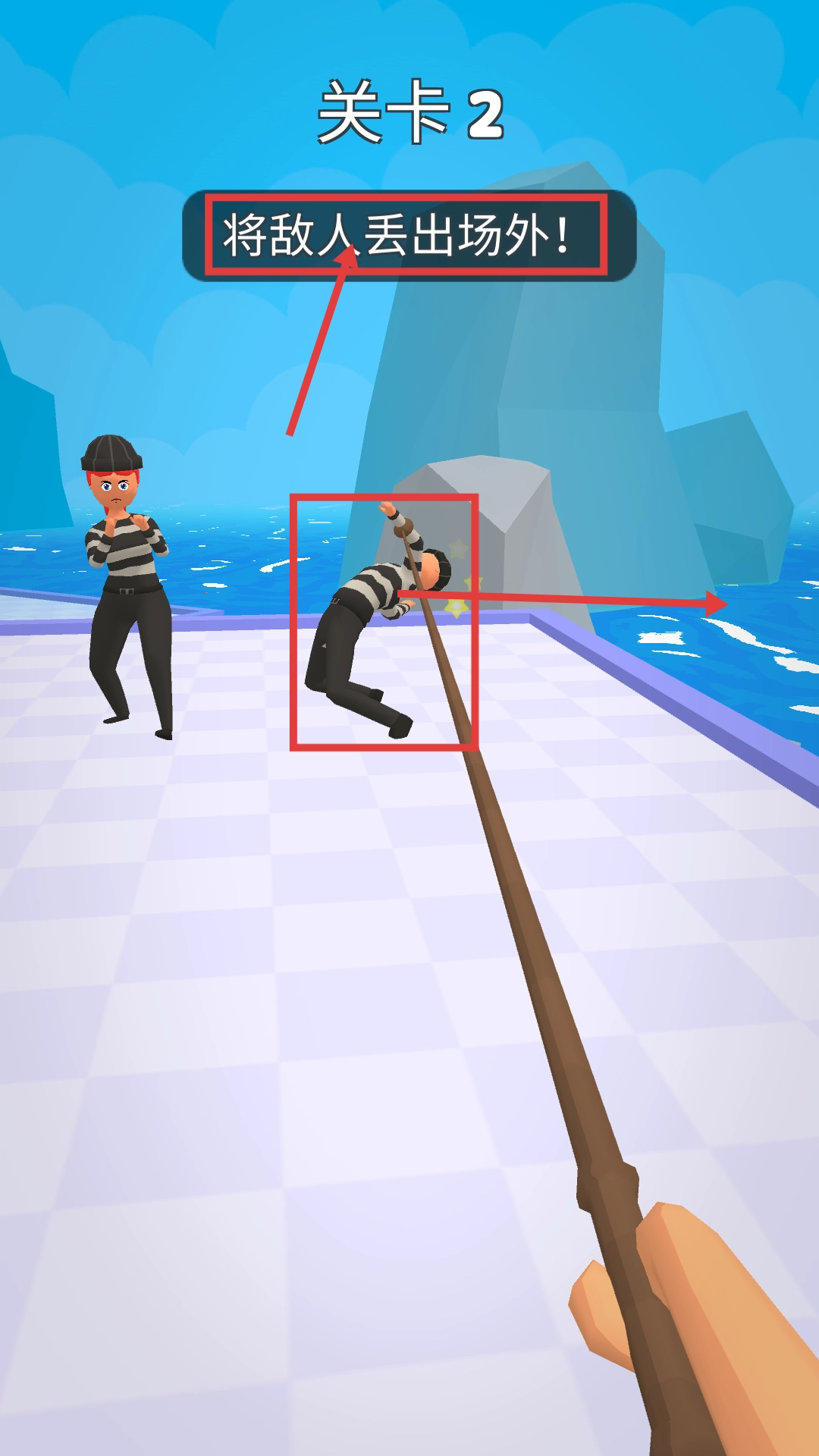 2、根据“把敌人抛到场地外”的提示,准确操作将敌人扔出平台,让其落入海中,达成关卡目标。