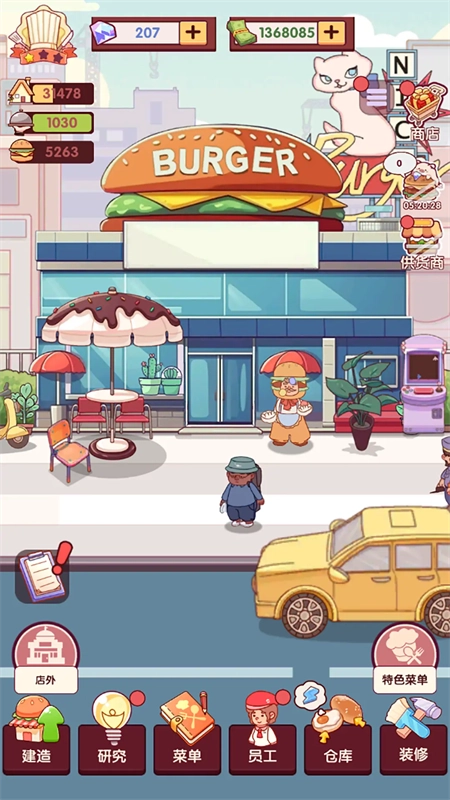 1、一开始你只是经营着一辆小小的汉堡餐车,等后续赚到足够资金后,就能对店铺进行升级了。