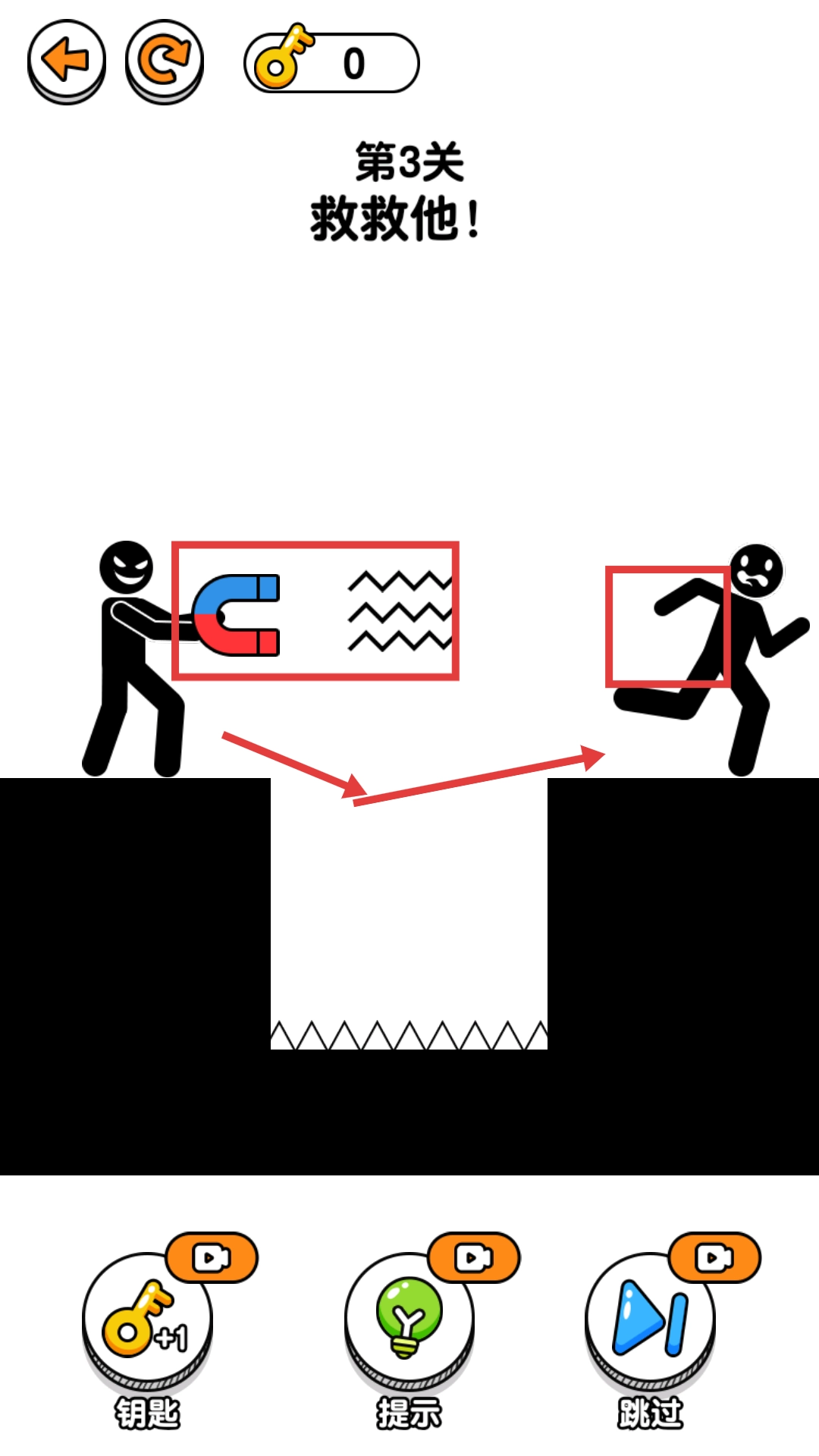 2、挑战【第3关-救救他】这一关卡时,要留意左侧的【磁铁】以及下方的【尖刺陷阱】,这些都属于需要规避的危险元素。