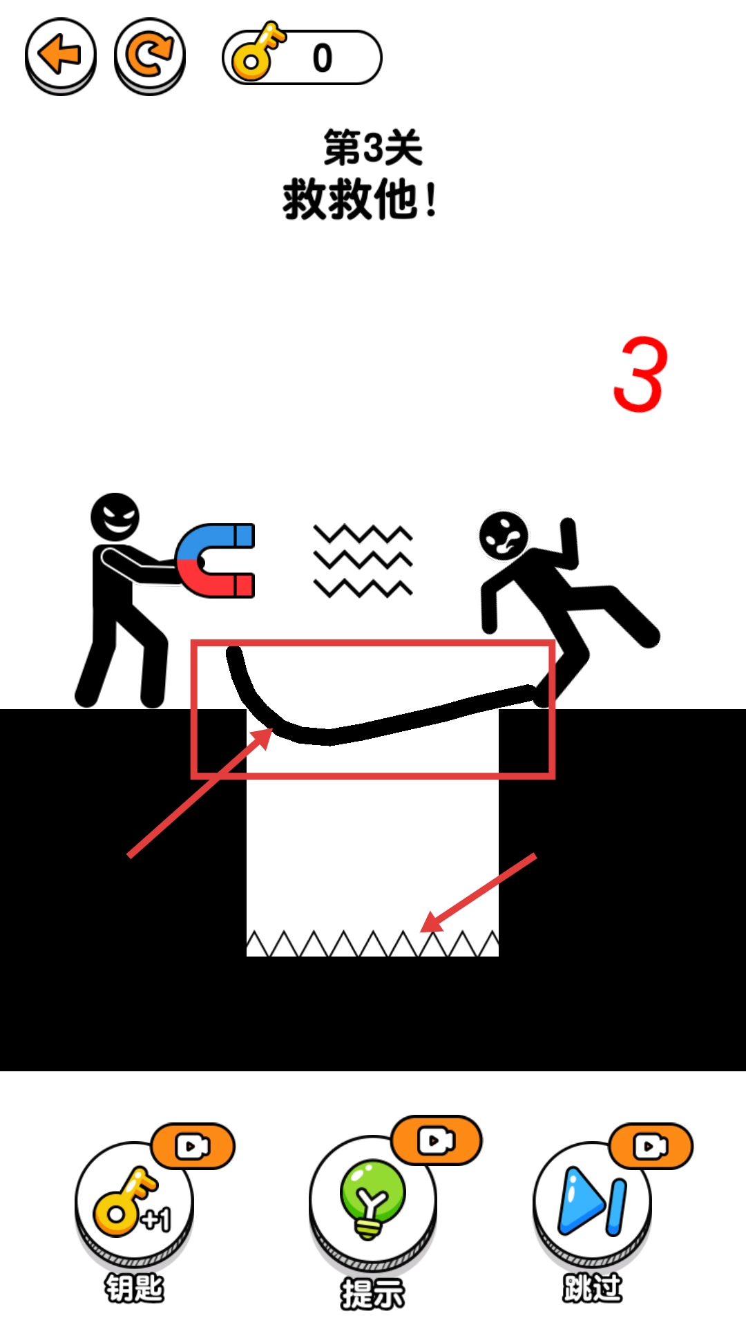 3、在【第3关】里,绘制曲线路径来连接各个平台,帮助火柴人安全通过,同时要避开【尖刺陷阱】和磁铁的影响。