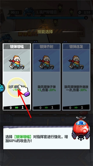 2、在进行技能选择时,建议优先考虑银弹增幅类技能,这类技能在选择后能够有效提升攻击力,例如可增加60%的攻击力,从而增强对丧尸的打击效果。