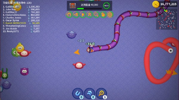 游戏过程中,玩家通过点击并拖动左下角的虚拟摇杆,操控自己的蛇蛇在地图里移动,收集周边的糖豆。同时,玩家也能点击右下角的闪电按钮开启加速功能,借助快速移动去尝试吞噬其他玩家的蛇蛇。一旦玩家被击败,游戏便会结束,系统会依据玩家的最终排名和分数发放对应的奖励。