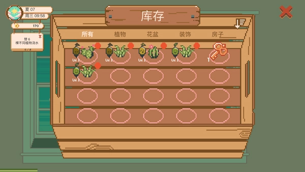 2、库存资源管理:从库存里挑选种子、工具或装饰品,根据实际需求取用,用于布置和种植。