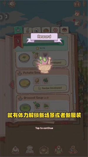 3. 游戏借助研发新汤谱、解锁新场景以及吸引新猫咪,为玩家打造出清晰且丰富的成长路径,持续向玩家传递正反馈并提供新的探索目标。