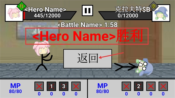 4、当敌方血量降为零时会显示【胜利】提示,这时可以点击【返回】按钮回到之前的界面,完成本次对战的收益结算。