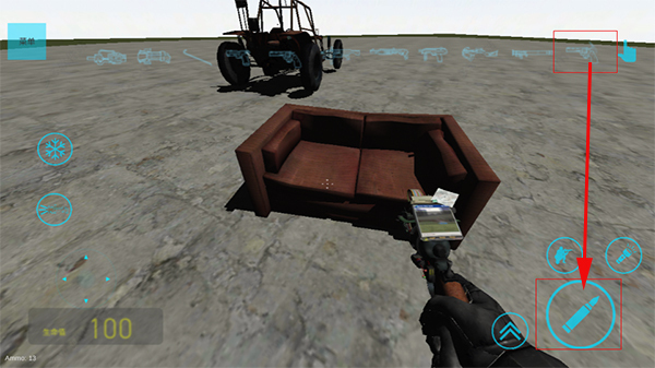 7、若要对生成的物品、人物或生物进行摧毁操作,需先切换武器,随后点击射击按钮。具体的操作步骤可参照下图。