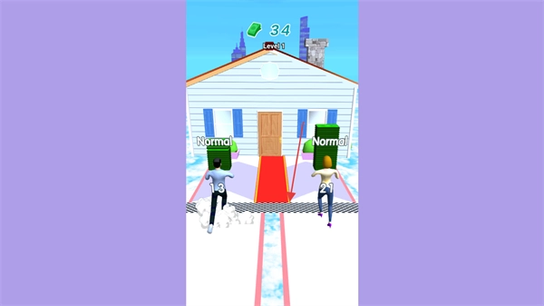 3、在关卡推进过程中,角色状态会显示为Normal,此时需要持续收集财富增益来提高金钱数值,进而引导角色到达房屋前方的终点区域。